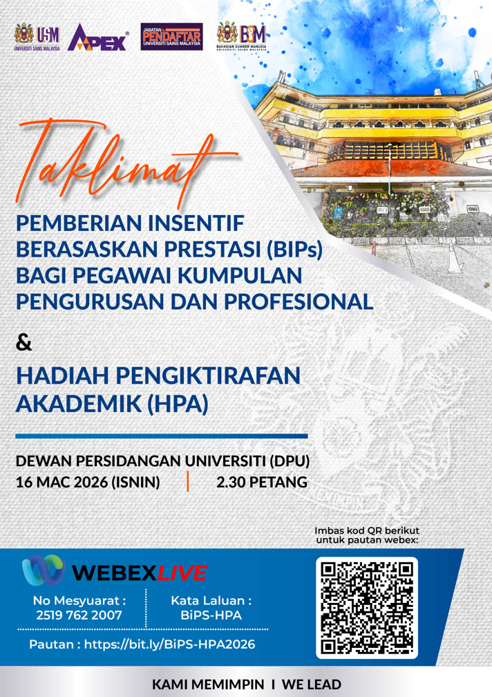 Bahagian Sumber ManusiaAras 4, Bangunan Canselori11800 USM, Universiti Sains MalaysiaTel : +604 653 6103Fax : +604 653 9107/4315Email : This email address is being protected from spambots. You need JavaScript enabled to view it. |