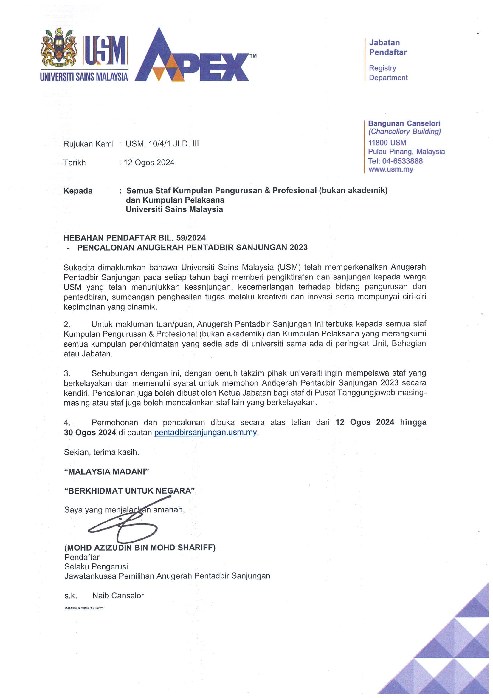 HEBAHAN PENDAFTAR BIL. 59 TAHUN 2024 : PENCALONAN ANUGERAH PENTADBIR SANJUNGAN 2023