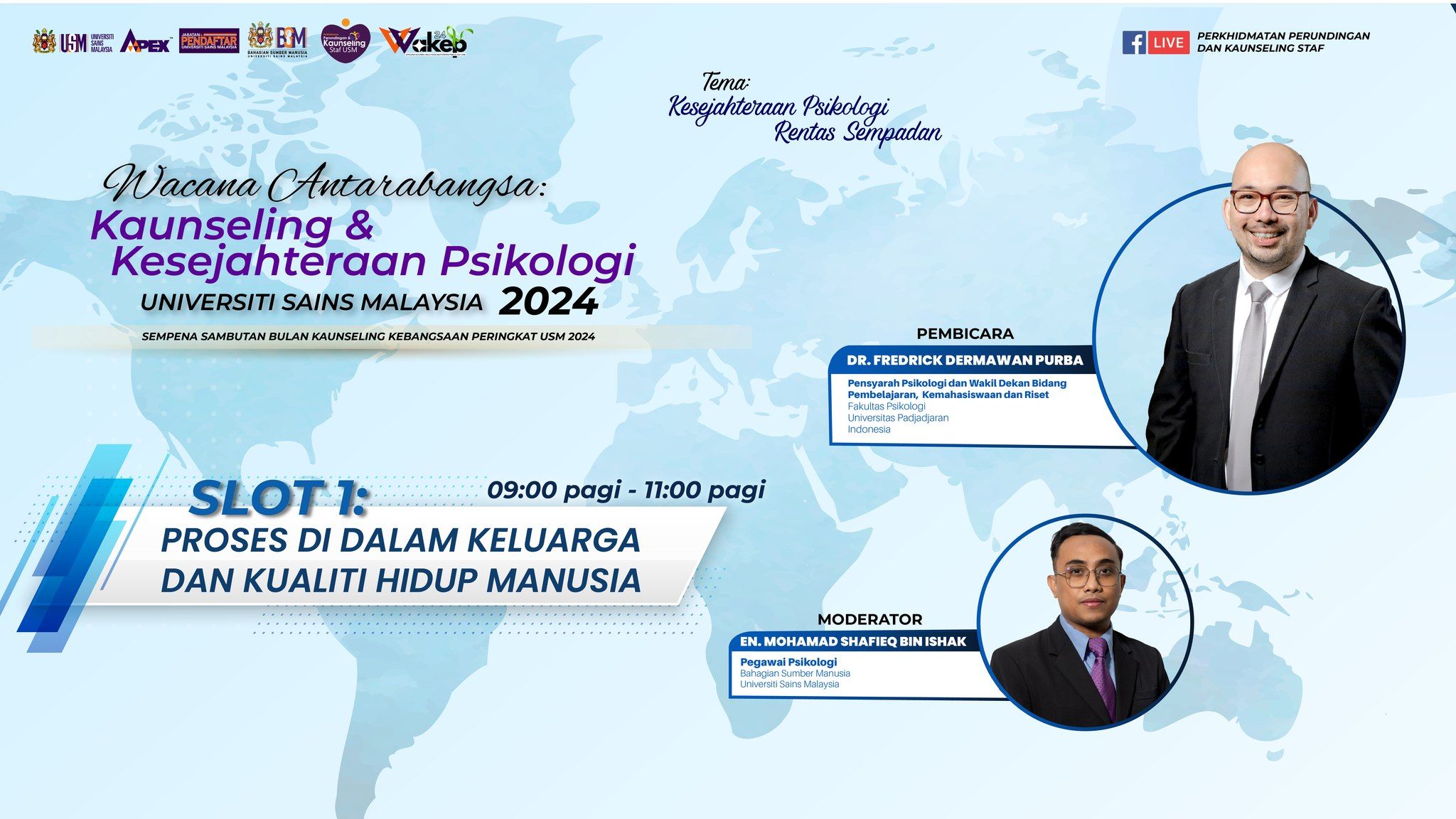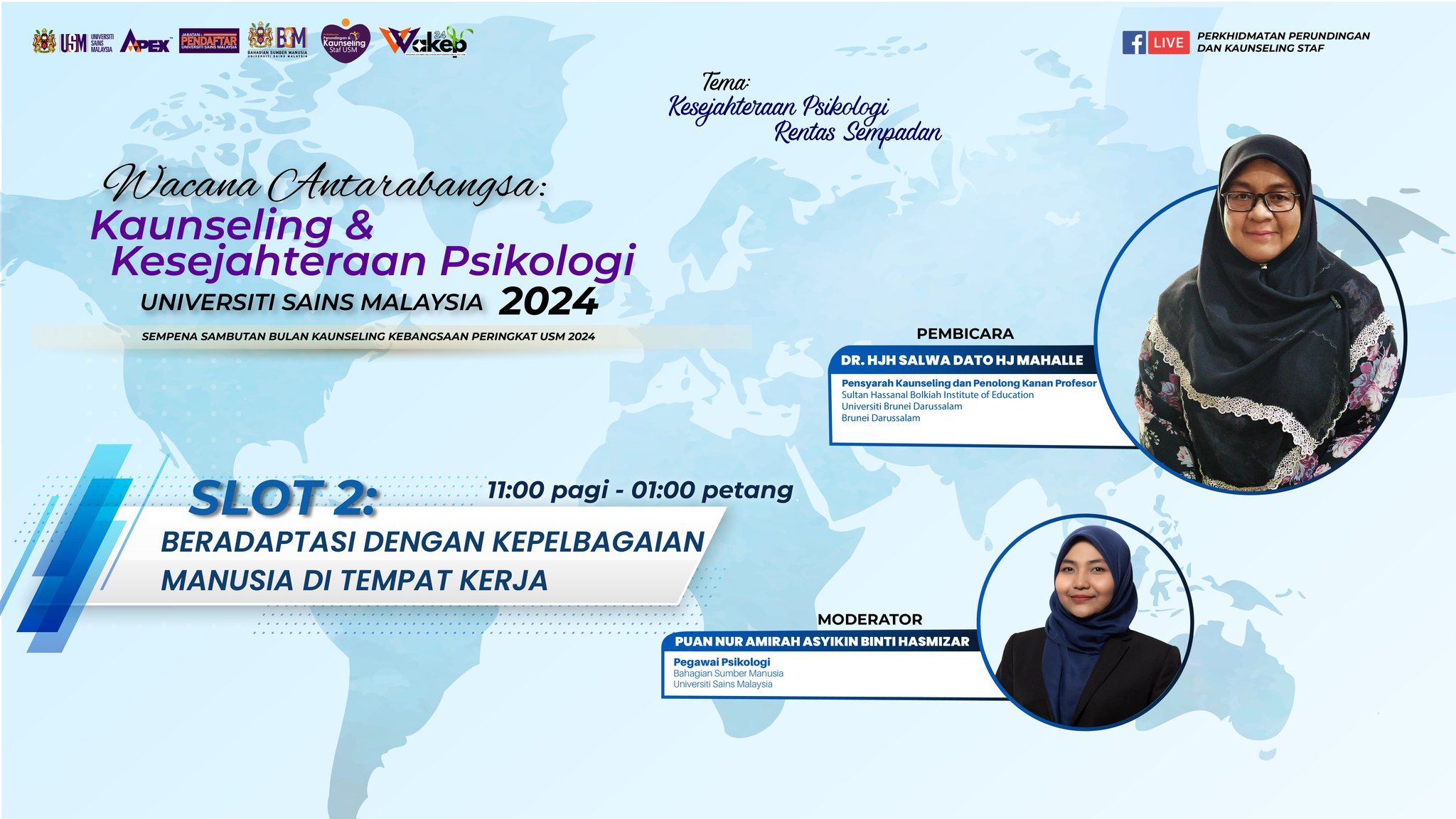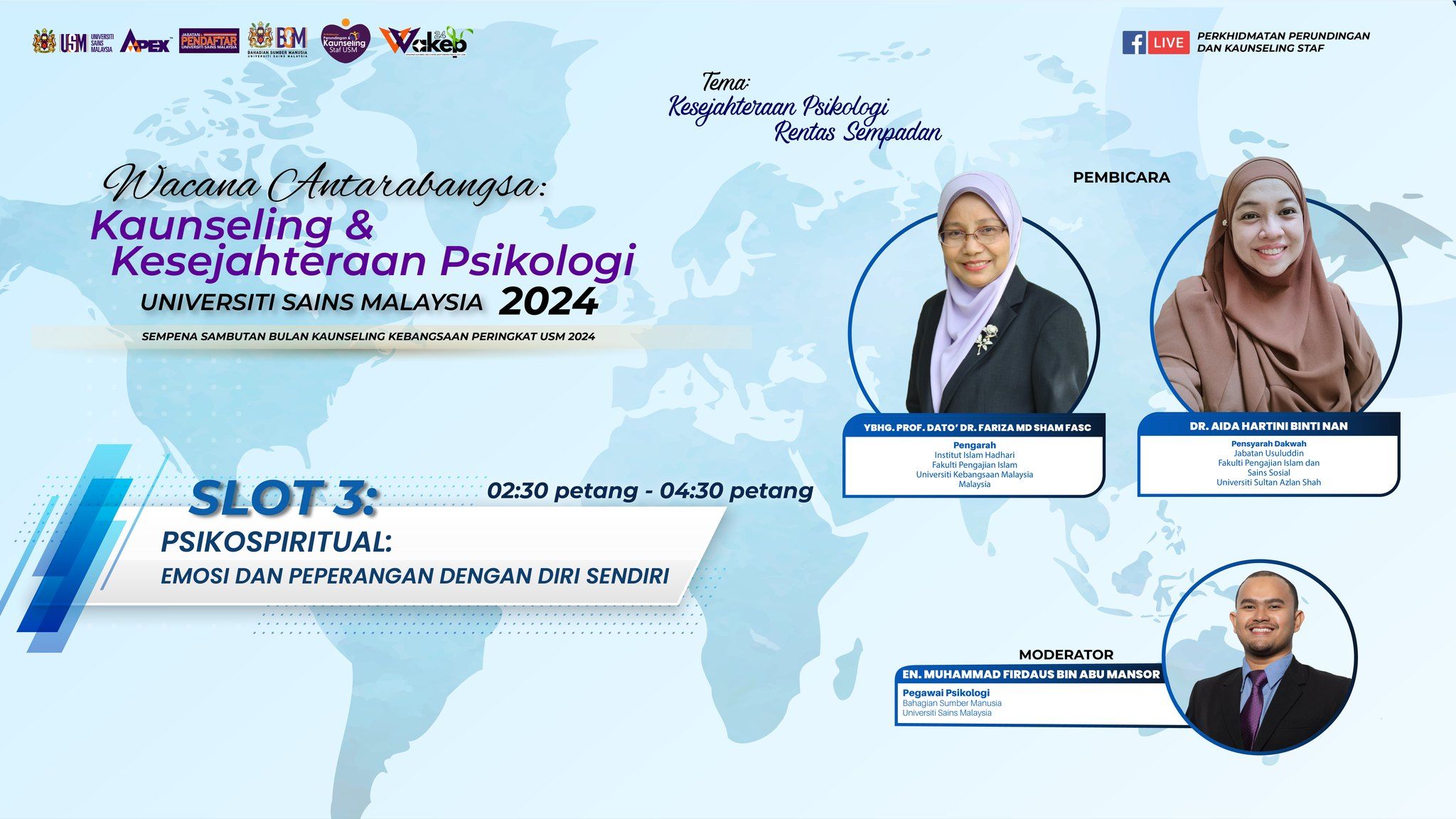 Untuk makluman YBhg. Datuk/Dato’ Seri/Dato’/Datin/Prof./Dr./Tuan/Puan, wacana ini akan bersiaran secara langsung melalui tiga (3) slot di Facebook Perkhidmatan Perundingan dan Kaunseling Staf USM.