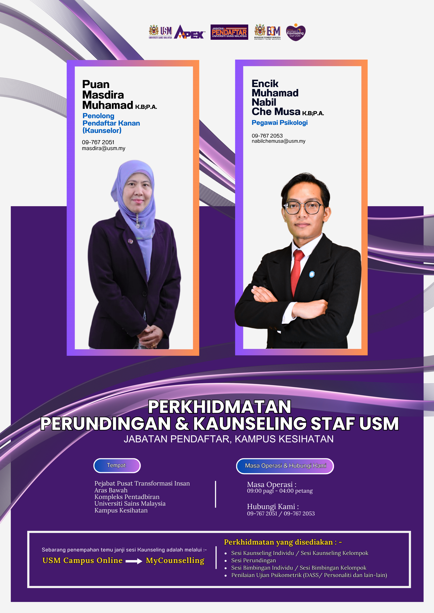 Sukacita dimaklumkan bahawa Universiti Sains Malaysia melalui Jabatan Pendaftar, Kampus Induk & Kampus Kesihatan berbesar hati menawarkan Perkhidmatan Perundingan & Kaunseling kepada seluruh warga Staf USM. Perkhidmatan Perundingan dan Kaunseling ini merupakan inisiatif Universiti dalam membantu warga Staf USM mengurus isu-isu kesejahteraan psikologi, emosi, tekanan kerja, hubungan interpersonal, keseimbangan kerja dan kehidupan serta pelbagai cabaran lain.