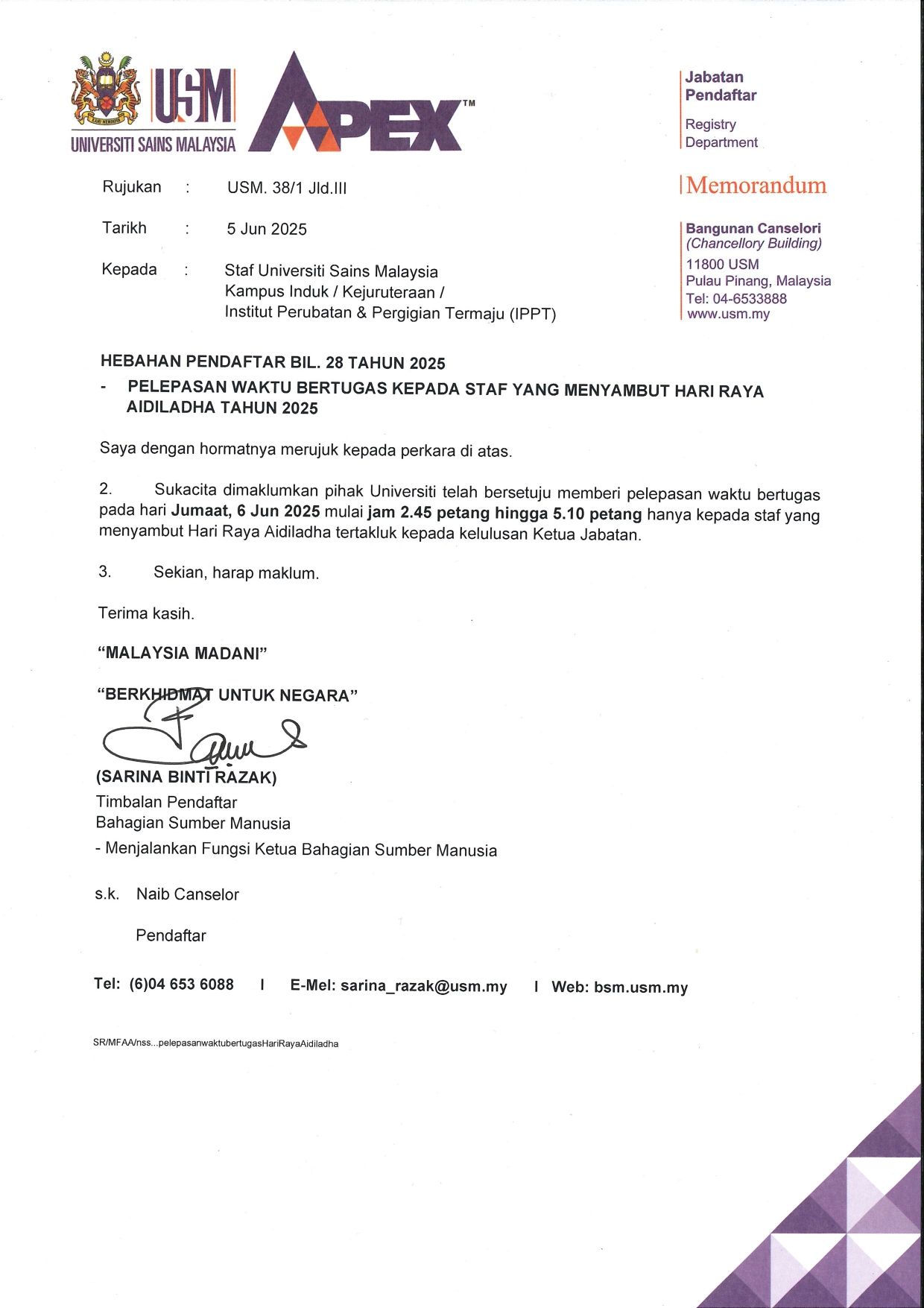 HEBAHAN PENDAFTAR BIL. 28 TAHUN 2025 - PELEPASAN WAKTU BERTUGAS KEPADA STAF YANG MENYAMBUT HARI RAYA AIDILADHA TAHUN 2025