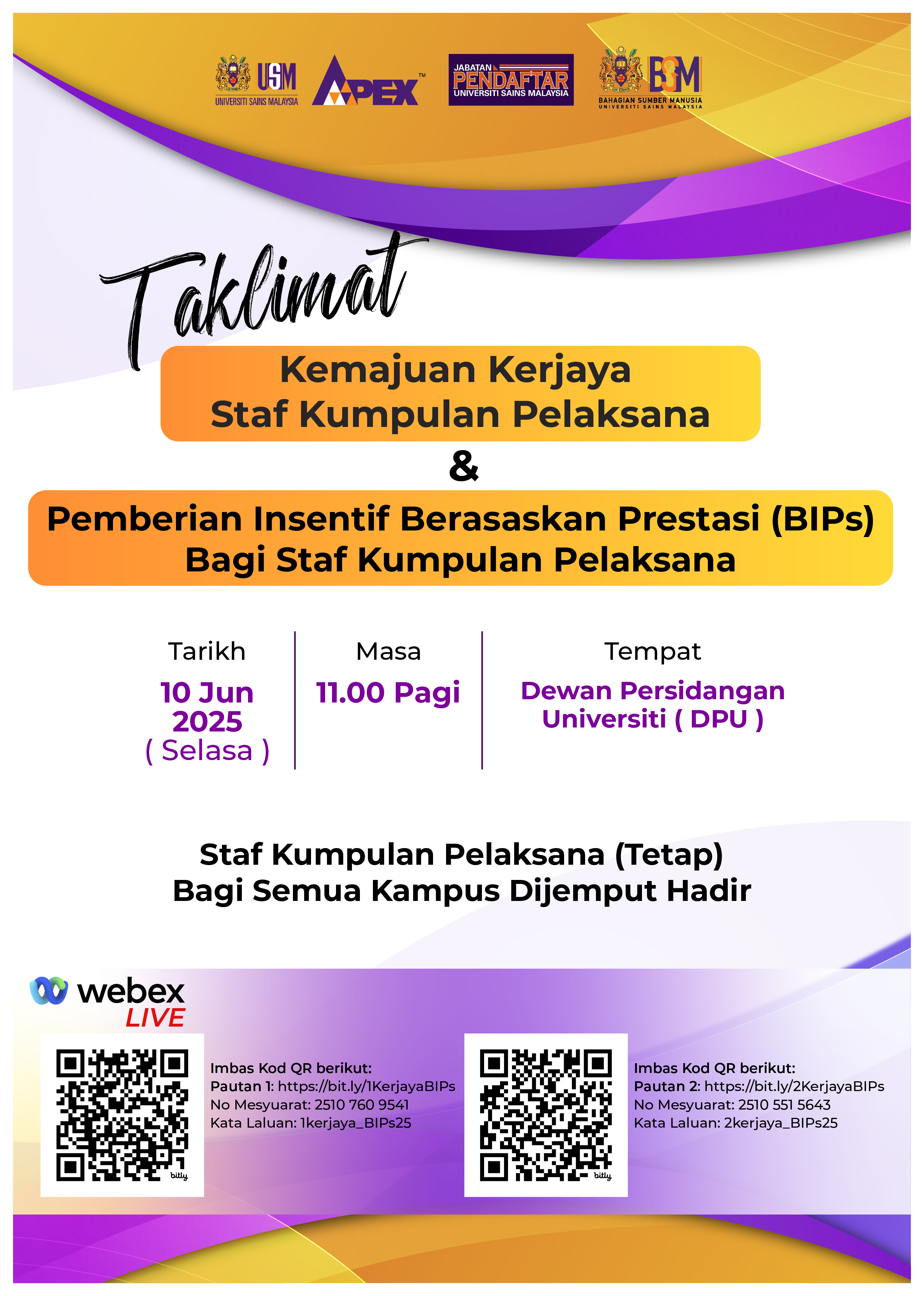 2. Sukacitanya dimaklumkan bahawa Bahagian Sumber Manusia (BSM), Jabatan Pendaftar akan mengadakan Taklimat Kemajuan Kerjaya Staf Kumpulan Pelaksana & Taklimat Pemberian Insentif Berasaskan Prestasi (BIPs) Bagi Staf Kumpulan Pelaksana.