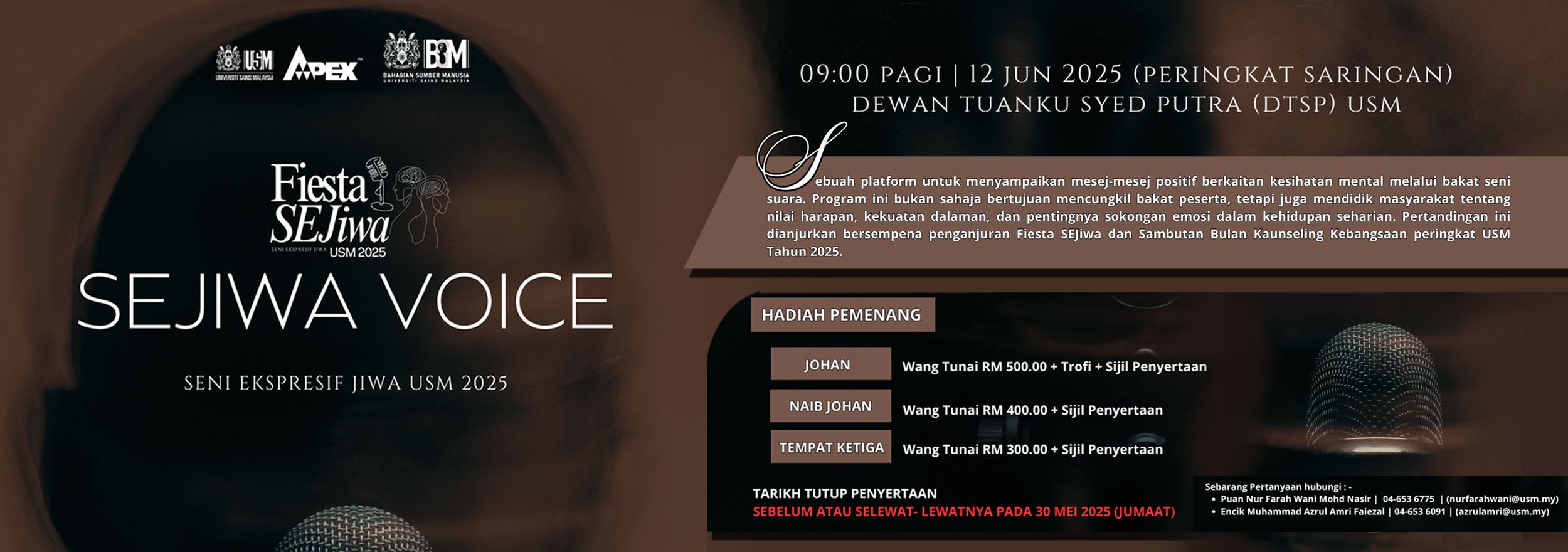 Adalah dengan ini dimaklumkan bahawa Bahagian Sumber Manusia, Jabatan Pendaftar, Universiti Sains Malaysia akan menganjurkan Pertandingan Saringan SEJIWA Voice USM 2025 seperti ketetapan berikut :-