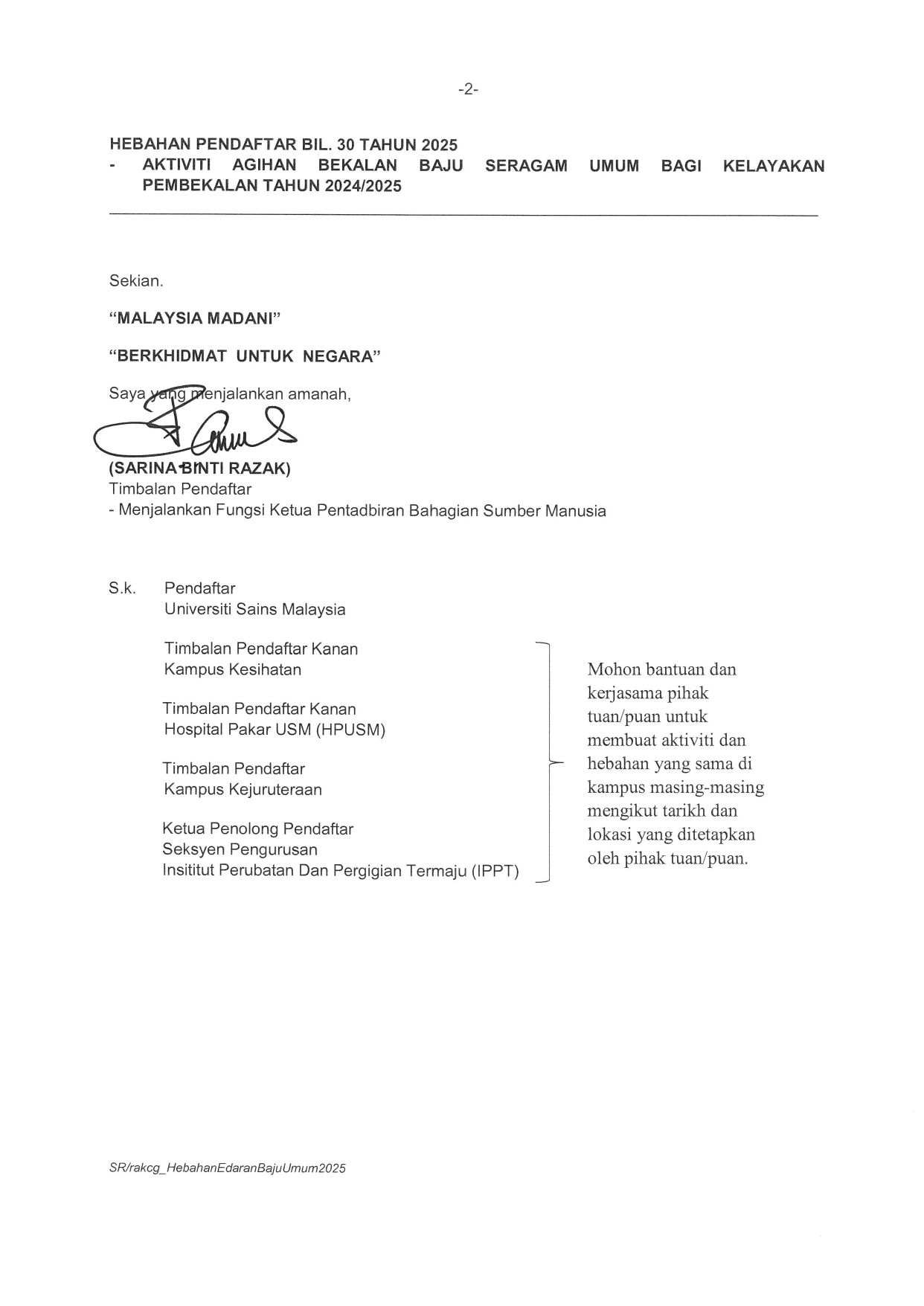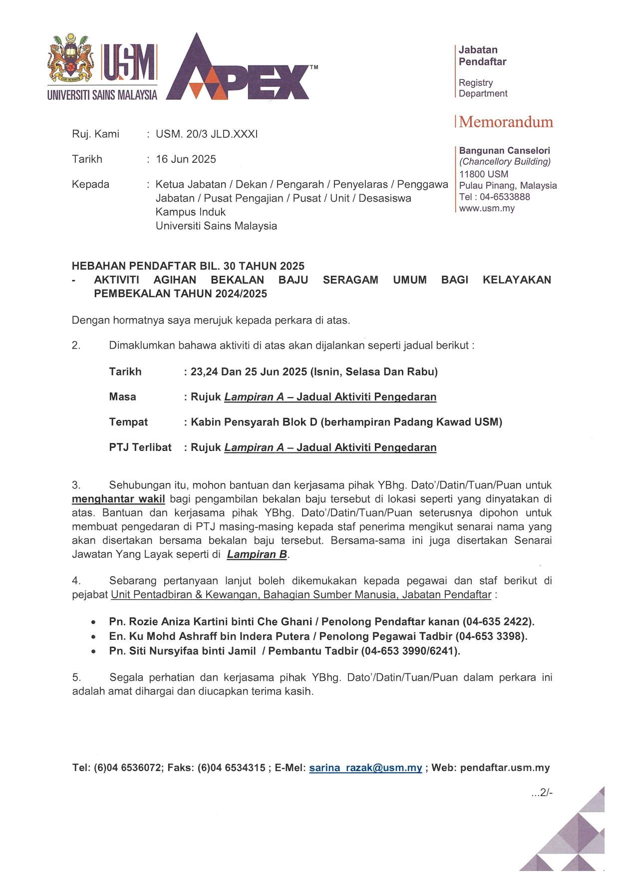 HEBAHAN PENDAFTAR BIL. 30 TAHUN 2025 - AKTIVITI AGIHAN BEKALAN BAJU SERAGAM UMUM BAGI KELAYAKAN PEMBEKALAN TAHUN 2024/2025